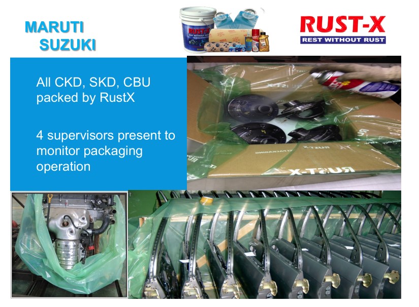 ★為MARUTI SUZUKI提供CKD全散裝件、SKD半散裝件和CBU整機(jī)出口的防銹包裝,4名監(jiān)管員現(xiàn)場(chǎng)監(jiān)督其防銹包裝工作。